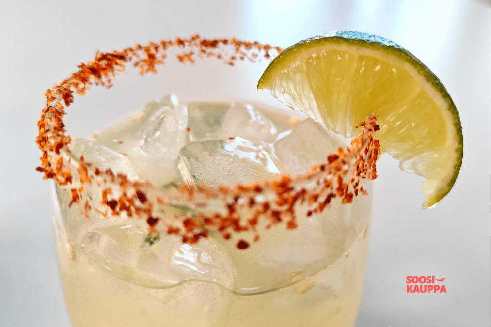Spicy Margaritassa chilillä koristeltu reuna on samalla olennainen osa makua. Pelkkää suolaakin voi käyttää, mutta Tajín on luontevin ja toimivin valinta kun tavoitteena on syvempi makuprofiili. Tajín yhdistää suolan, limen hapokkuuden ja miedon tulisuuden tavalla, joka tukee juoman ainesosia: