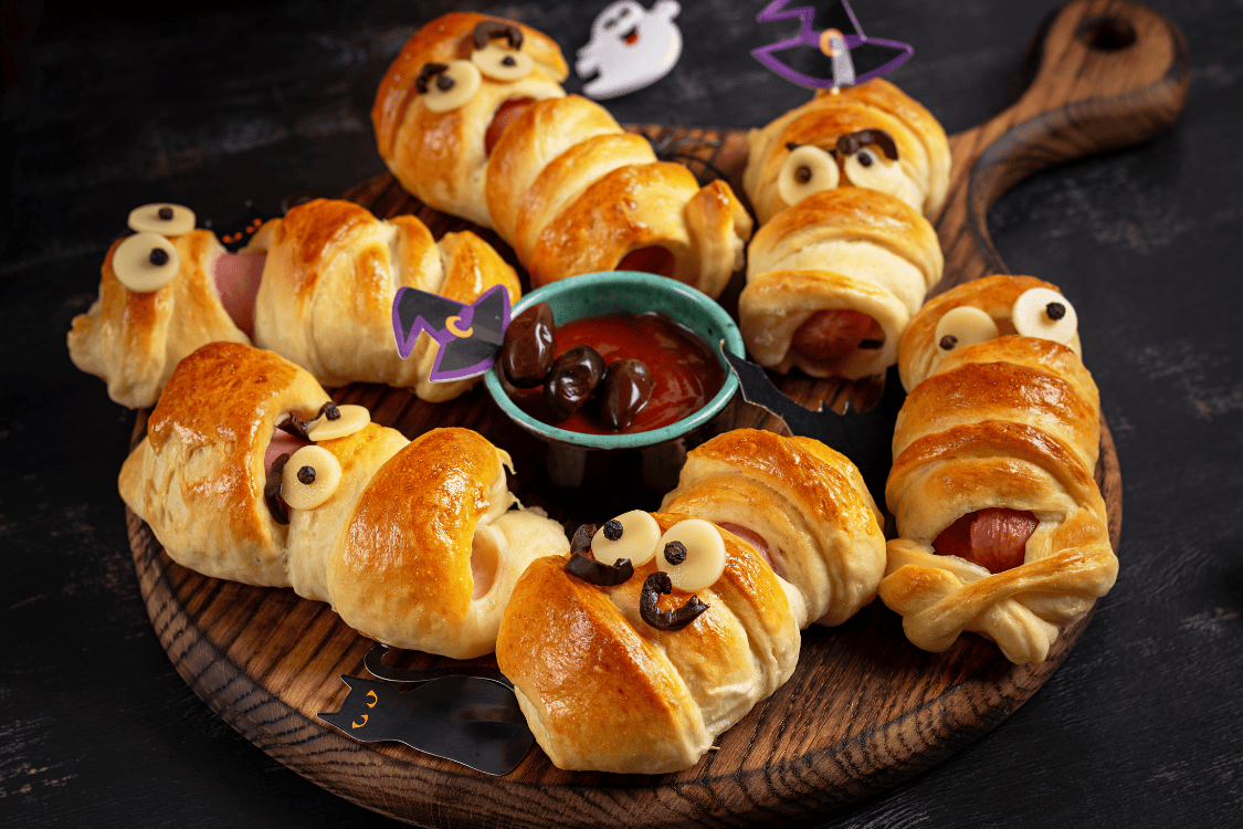 - Laita tippoja chilikastiketta muumioille “silmiksi” ja tarjoile.