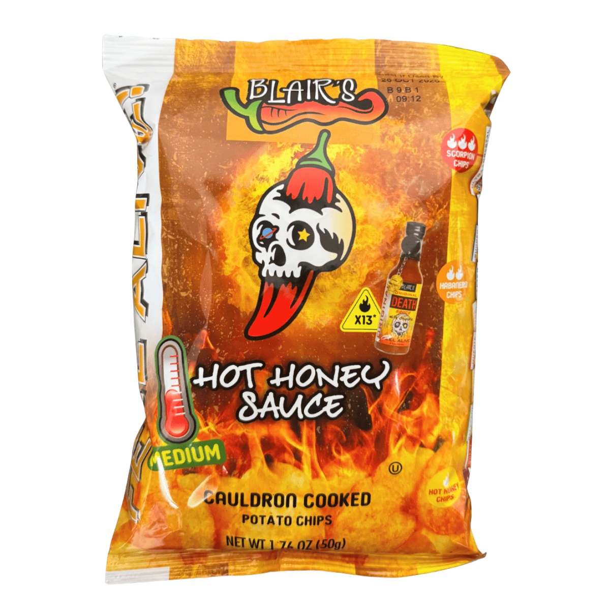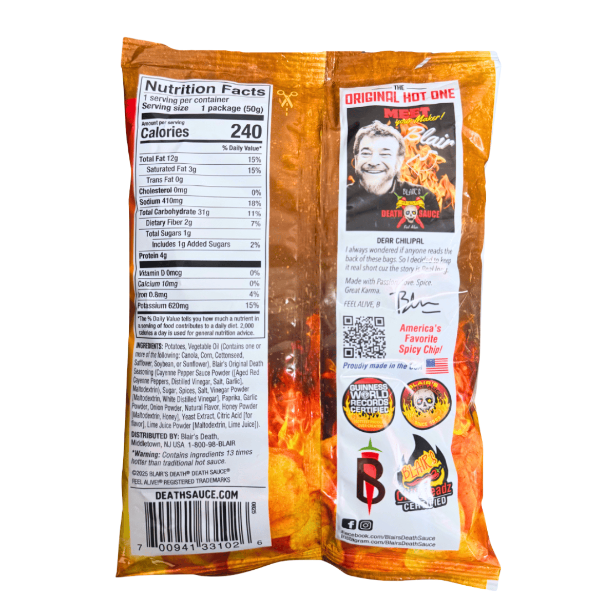 Ainesosat: Peruna, kasviöljy (yksi tai useampi seuraavista: rypsi-, maissi-, puuvillansiemen-, saflori-, SOIJA– tai auringonkukkaöljy), Blair’s Original Death Sauce -mausteseos (Cayenne-chilikastikejauhe (kypsytetyt punaiset Cayenne-chilit, tislattu etikka, suola, valkosipuli), maltodekstriini), sokeri, mausteet, suola, etikkajauhe (maltodekstriini, valkoviinietikka), paprika, valkosipulijauhe, sipuliaromi, luontainen aromi, hunajajauhe (maltodekstriini, hunaja), hiivauute, sitruunahappo (aromin vuoksi), limemehujauhe (maltodekstriini, limemehu).