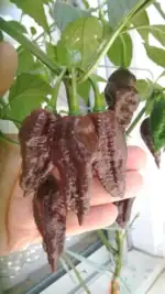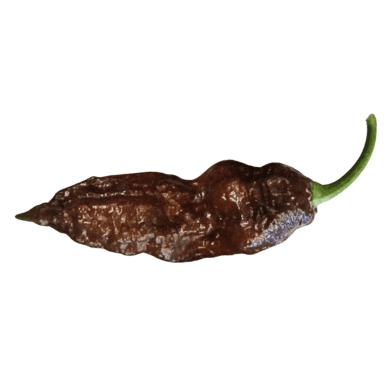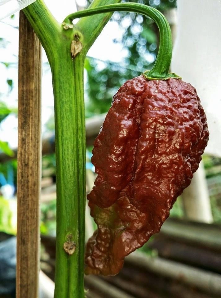 Hedelmä on 5–6 cm pitkä, ohutseinäinen, ryppyinen ja teräväkärkinen. Kypsänä väri on syvän tummanruskea. Podit sisältävät runsaasti kapsaisiinia ja siemeniä, ja tulisuus vapautuu nopeasti käsiteltäessä ja kypsennettäessä. Ulkonäkö ja rakenne viestivät selvästi lajikkeen äärimmäisestä voimakkuudesta.