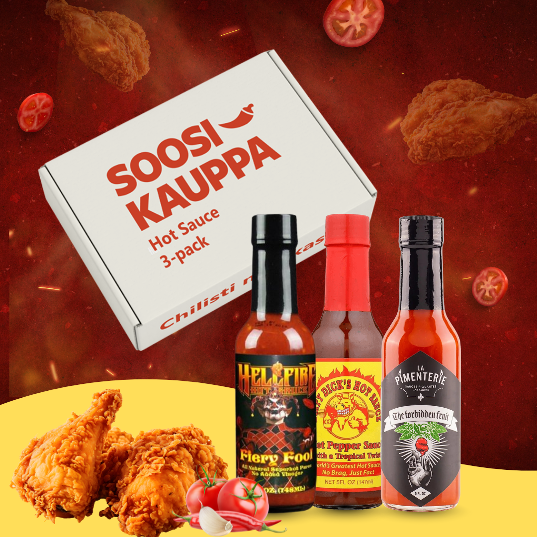 Ainesosat: 7 Pot Red -chili, Carolina Reaper -chili, Bhut Jolokia -chili, Trinidad Scorpion -chili, omenasiiderietikka, aurinkokuivattu tomaatti, merisuola, valkosipuli, juustokumina.