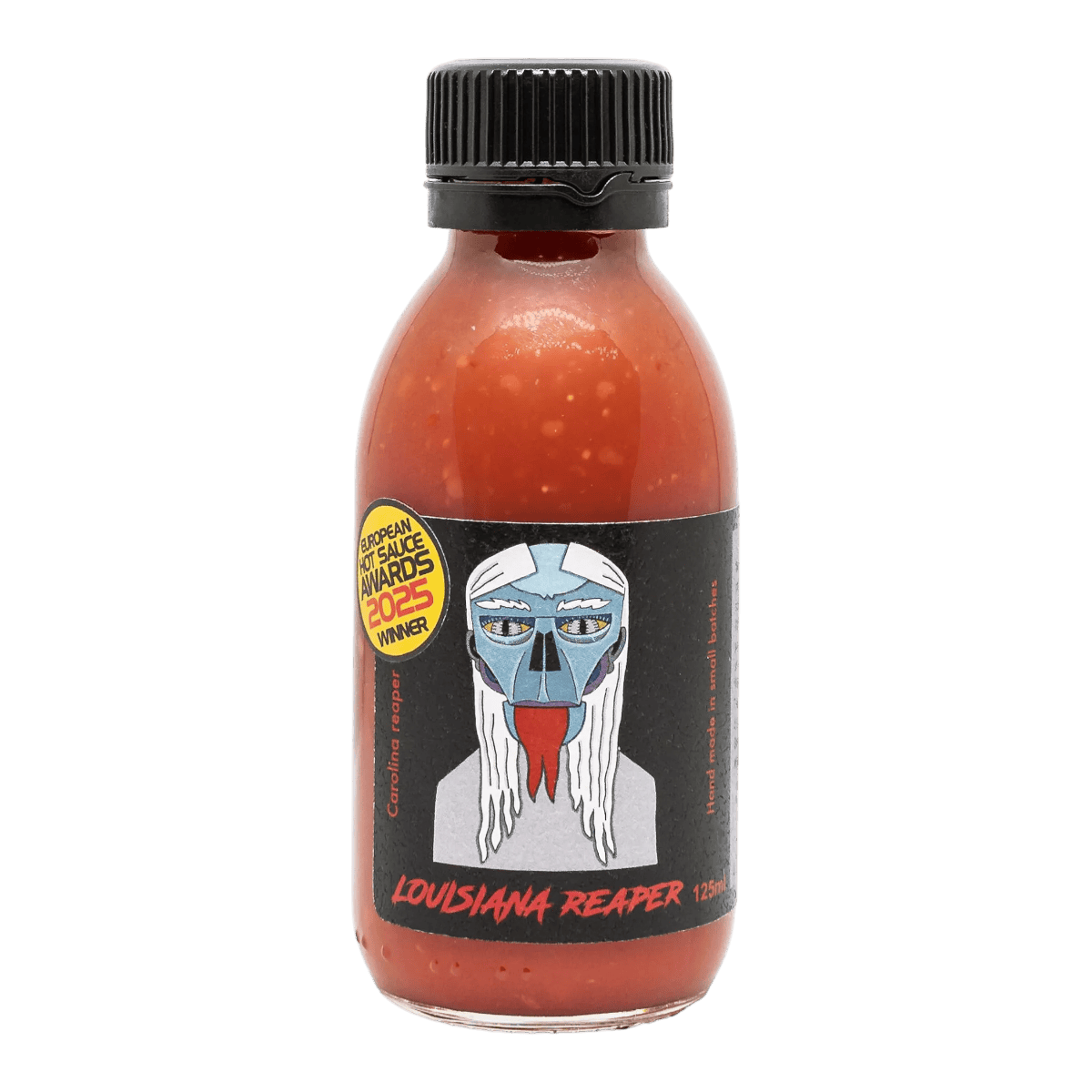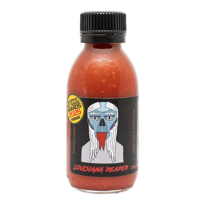 Ainesosat: Fermentoitu Carolina Reaper -chili (40 %), omenasiiderietikka, suola, vesi, valkosipuli, ruokosokeri, ksantaanikumi.