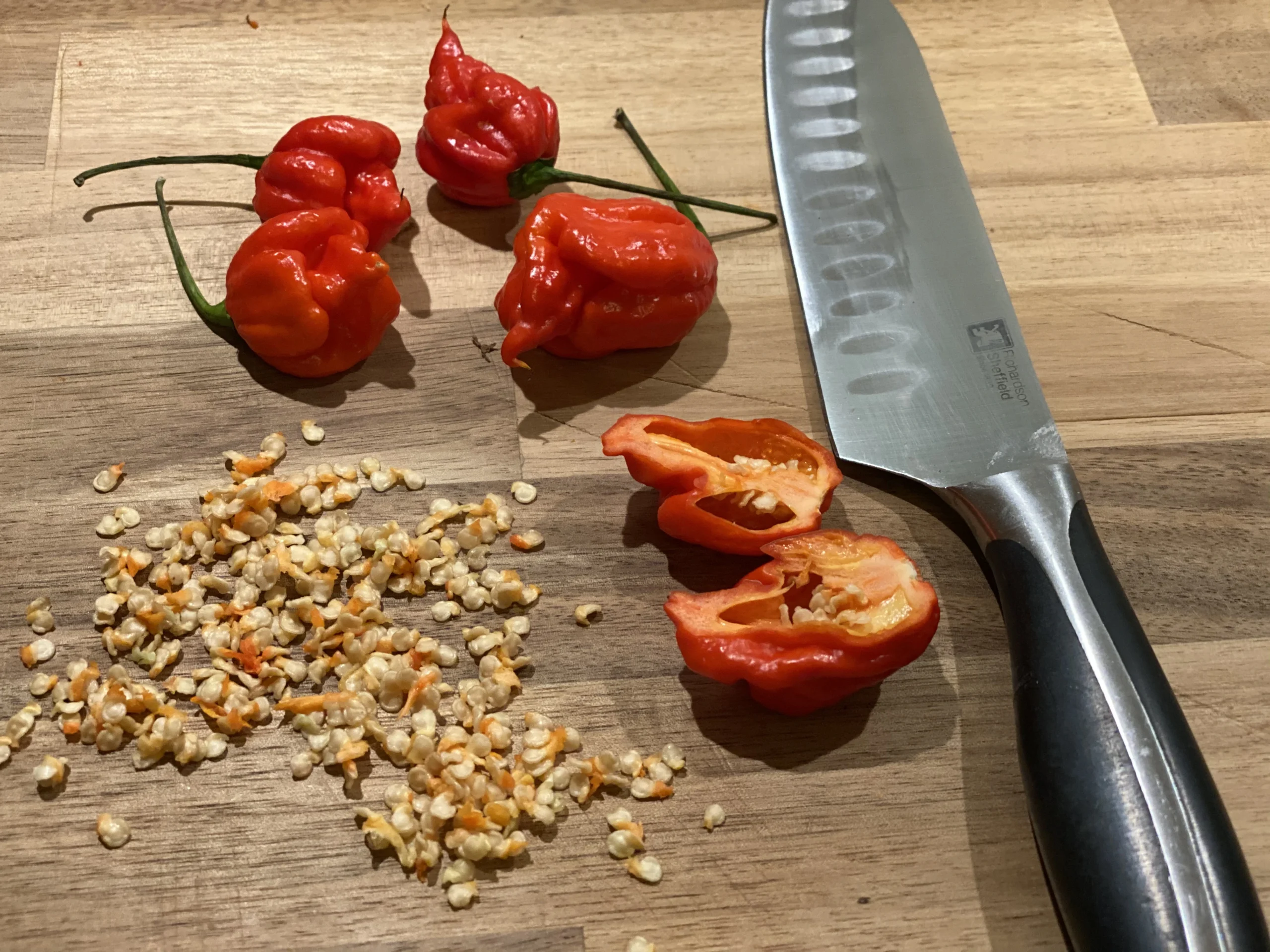 Hedelmä on 3–5 cm pitkä, epäsäännöllisen muotoinen ja voimakkaasti ryppyinen. Kärjessä on usein selkeä pistin. Kypsänä väri on kirkkaan punainen. Hedelmäliha on ohuehkoa, ja sisällä on runsaasti kapsaisiinia sekä siemeniä. Tulisuus vapautuu nopeasti käsiteltäessä ja kypsennettäessä.